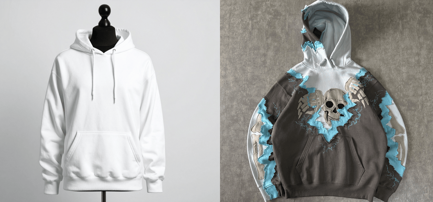 We start with fresh blanks and transform them — cut, stitched, reworked — into something you won’t find anywhere else.